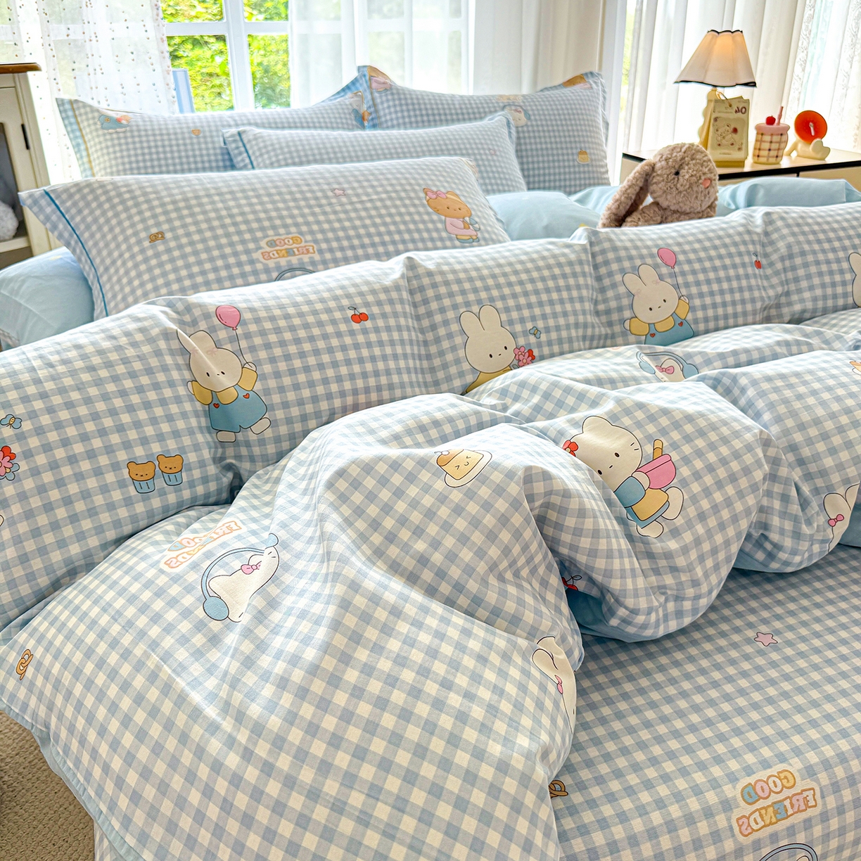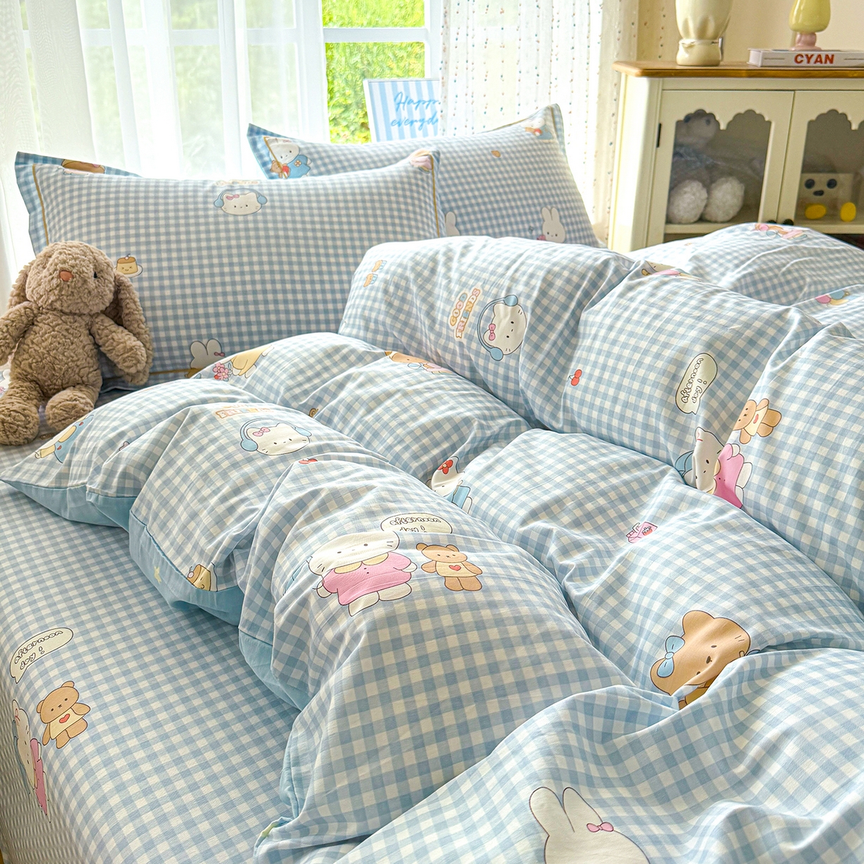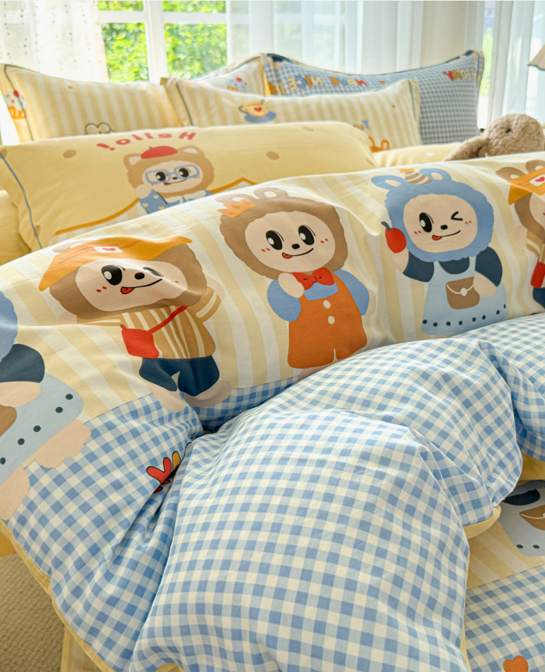 红粉佳人家纺 2025春夏新款12868喷气全棉纯棉印花单被套第二批 格子猫咪